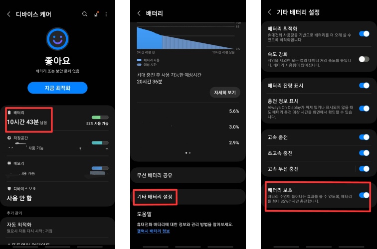 '기타 배터리 설정'에 들어오면 배터리 충전에 관련된 설정들을 볼 수 있습니다. 이 중 가장 아래에 있는 '배터리 보호'를 클릭해 주면 됩니다. '배터리 보호' 아래에 작은 글씨로 되어 있는 설명대로 수명이 늘어나는 효과를 보기 위해 85%까지만 충전이 됩니다.