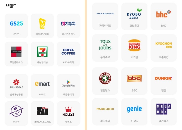 커피에서부터 백화점, 편의점, 영화, 도서 등 다양한 브랜드가 있습니다. 브랜드별로 캐시백이 적용되는 할인율은 다르며, 이벤트 기간에 최대 16%까지 할인하는 브랜드도 있습니다.