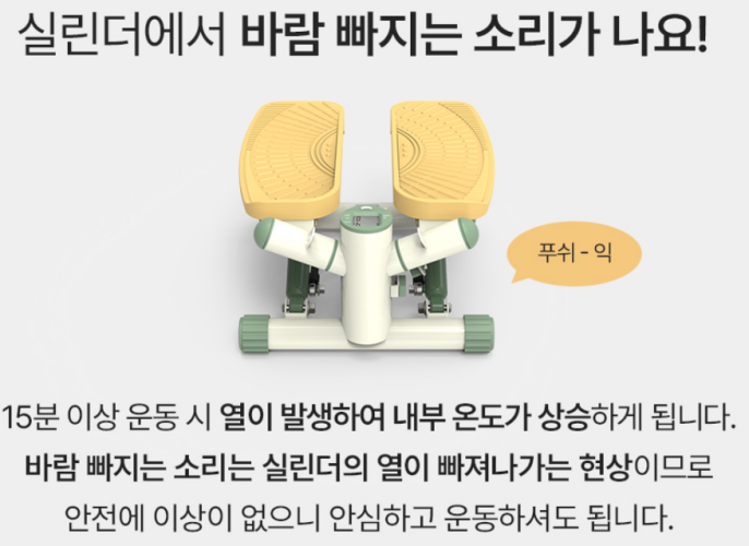 유압실린더형 스텝퍼로 운동을 20분 정도 하니 실린더에서 공기가 빠지는 소리가 들렸습니다. 고장 난 것 같진 않았지만 실린더를 만져보니 손을 대지 못할 정도로 뜨거웠습니다.