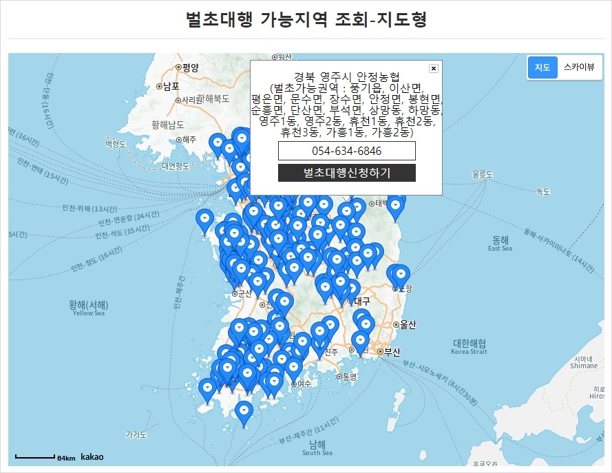 조회하기를 눌러 지역을 검색하면, 벌초대행 가능지역과 해당 지역농협의 전화번호를 확인할 수 있습니다.