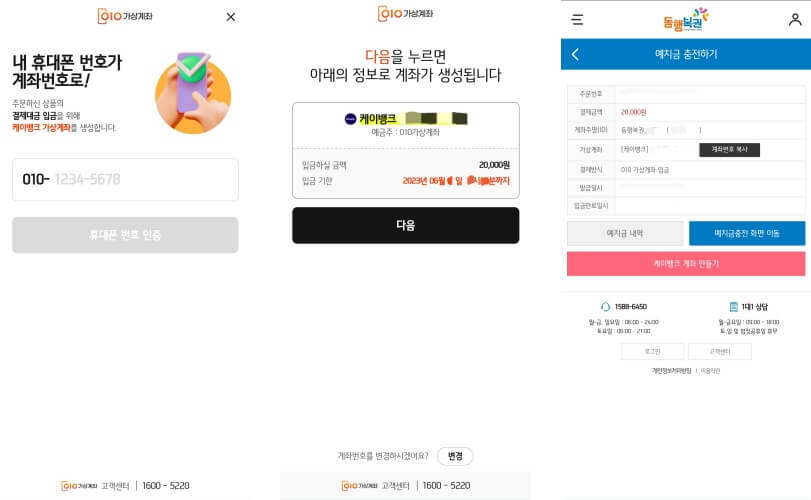 금액설정까지 완료되면 창이 새롭게 뜹니다. 내 휴대폰 번호를 입력하면 이 번호가 예치금을 입금하는 가상계좌가 되는 것입니다. 입금은행은 케이뱅크이고 계좌번호는 내 핸드폰 번호가 되며 예금주는 010가상계좌입니다. 기한 내에 입금만 하면 복권을 구매할 수 있는 상태가 됩니다. 복권을 구매할 때마다 별도로 결제하는 방식이 아니며 복권 구매 시 예치금에서 차감되는 방식입니다.