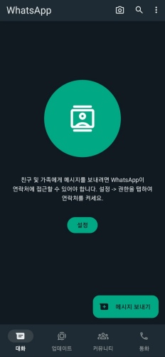 7. 마지막 화면입니다. 저는 연락처 접근을 차단했기 때문에 아래 사진과 같이 보입니다. 허용했다면 내 연락처에 등록된 사람들 중에서 누가 왓츠앱을 사용하는지 알 수 있을 것입니다. 그 사람과는 왓츠앱에서 대화할 수 있겠죠.