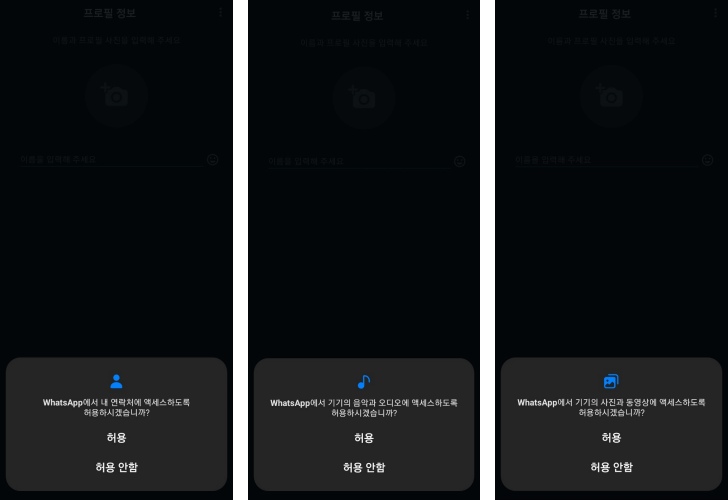 4. 그러면 입력한 번호로 코드가 발송되며 코드를 입력하면 연락처와 미디어 접근여부를 묻습니다. 연락처, 음악과 오디오, 사진과 동영상에 접근하는 것을 허용하고자 하면 '허용'을 클릭해 주시면 됩니다.