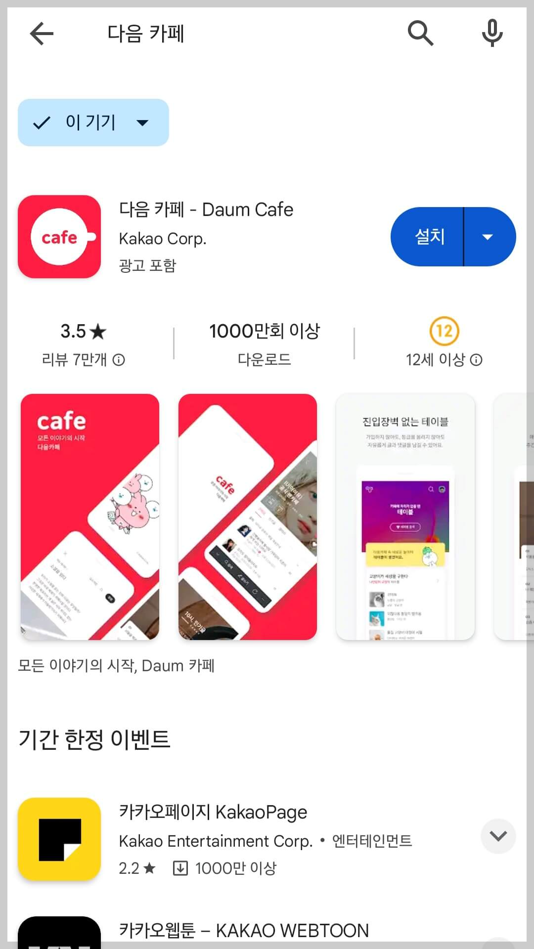① 다음카페 앱 다운로드: 구글 플레이스토어 또는 애플 스토어에서 '다음 카페'를 검색 후 앱을 설치해 줍니다.