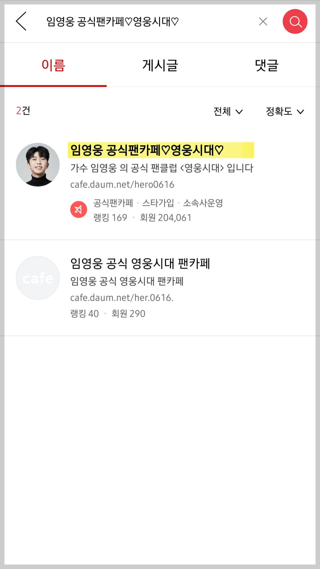 ② 임영웅 카페 접속: 앱 설치가 완료되면, 검색창에 임영웅 팬카페를 검색하여 '임영웅 공식펜카페 영웅시대'에 들어가 줍니다.