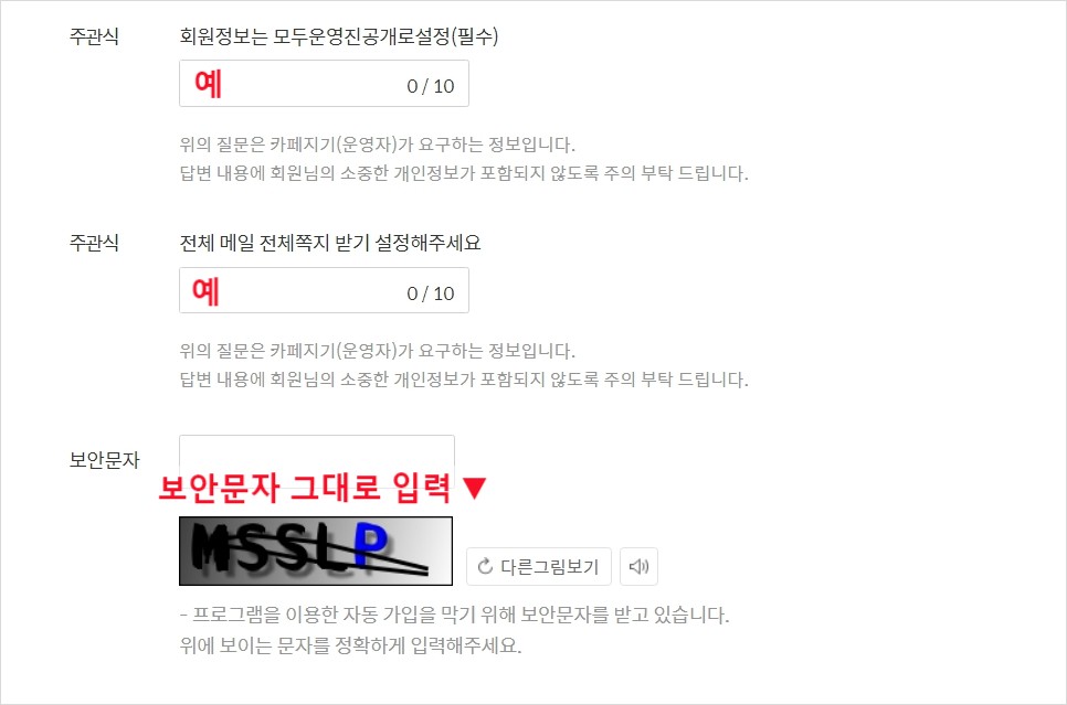 ⑥주관식 답변 & 보안문자 입력: 주관식 답변에는 모두 '예'로 입력 후 보안문자를 보이는 그대로 입력해 줍니다.