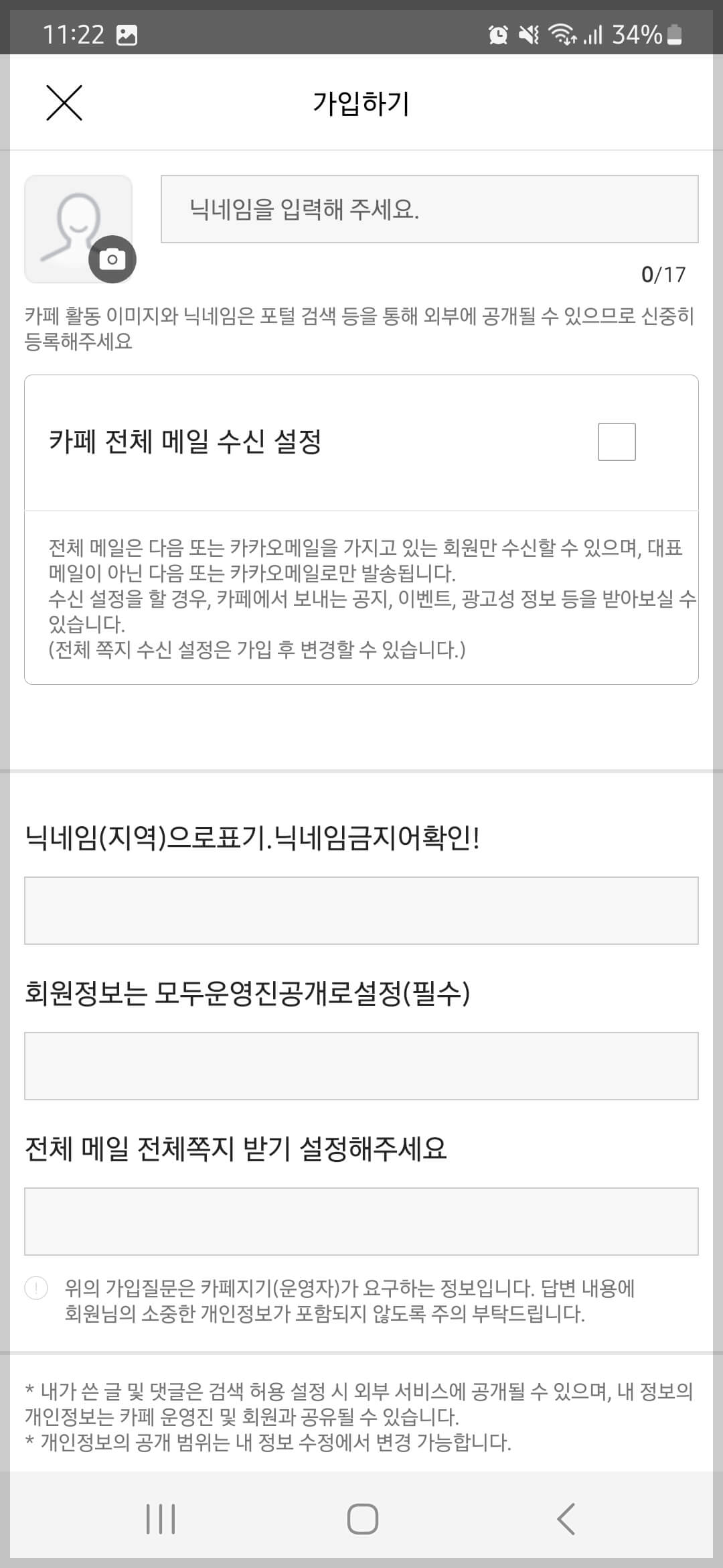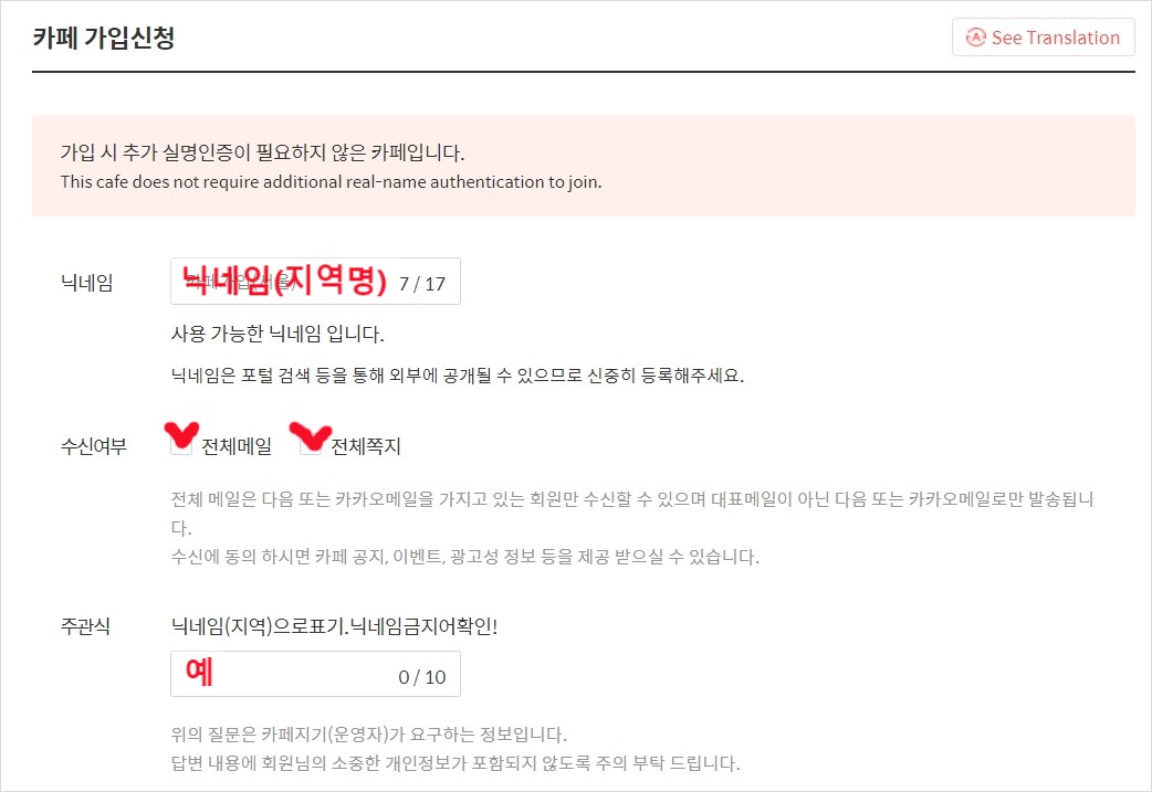 ⑥ 닉네임 / 카페 메일 수신 설정 / 주관식 정보 입력: 카페 닉네임은 닉네임(지역명)으로 입력해줍니다. 카페 전체 메일 수신 설정은 체크 박스를 선택하고 아래 주관식 답변은 모두 '예'로 입력합니다.