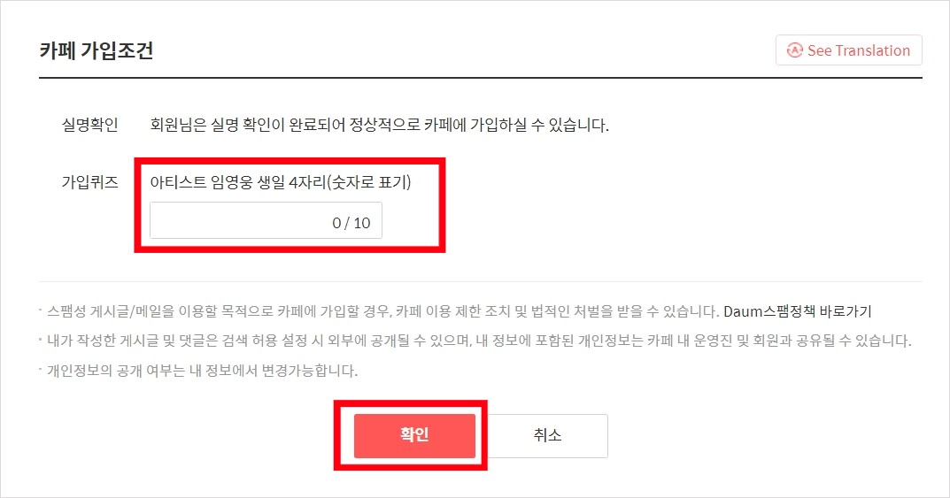 ⑤ 카페 가입질문 입력: 아디스트 임영웅 생일 4자리를 숫자로 입력해 줍니다. 임영웅의 생일은 6월 16일로 '0616'을 입력 후 확인 버튼을 눌러줍니다.