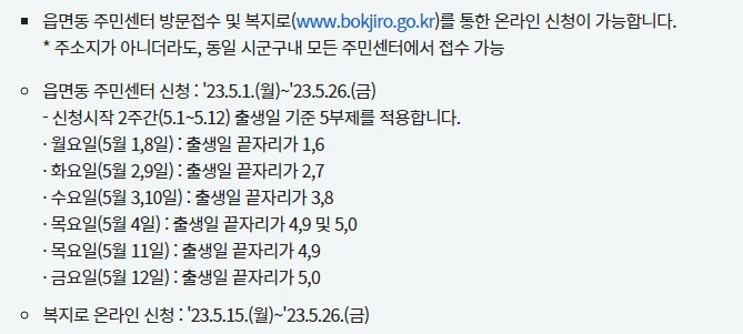 신청기간은 2023년 5월1일부터 26일까지입니다. 신청방법은 5월 1일부터 12일까지 신청시작 2주간은 읍면동 주민센터에서 5부제로 신청이 가능합니다. 12일 이후에는 5부제와 상관없이 아무 때나 읍면동 주민센터에 방문하셔서 신청이 가능합니다.