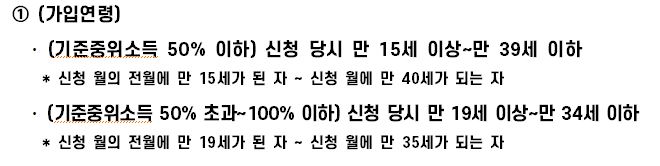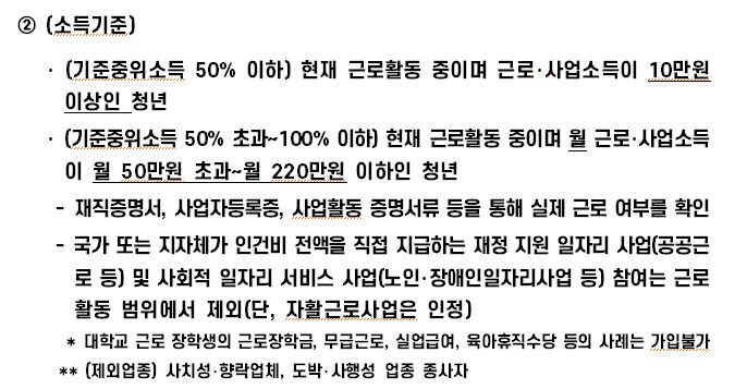 청년내일저축계좌는 소득이 없는 청년에게는 지원되지 않습니다. 사업소득이든 근로소득이든 개인 소득이 있어야 지원이 가능합니다. 지원금이나 장학금 같은 수익은 인정되지 않고, 사업자를 통한 소득 또는 근로여부 확인을 통한 소득만이 인정됩니다. 최소한으로 돈을 벌겠다는 노력은 하고 있고, 그렇다고 너무 많이 벌지 않는 청년에게 지원해 주기 위해 만든 조항으로 생각됩니다. 중위소득 50%이하 청년은 10만 원 이상 소득이 있어야합니다. 중위소득 50-100% 청년은 월 50만 원 초과 220만 원 이하 소득이 있어야 합니다.