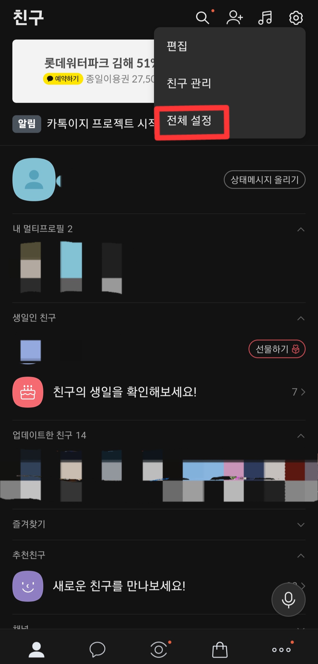 먼저 우측 상단의 톱니바퀴(설정)를 클릭한뒤 전체 설정을 클릭해 줍니다.