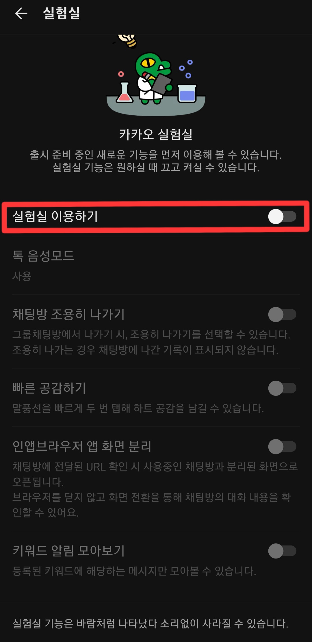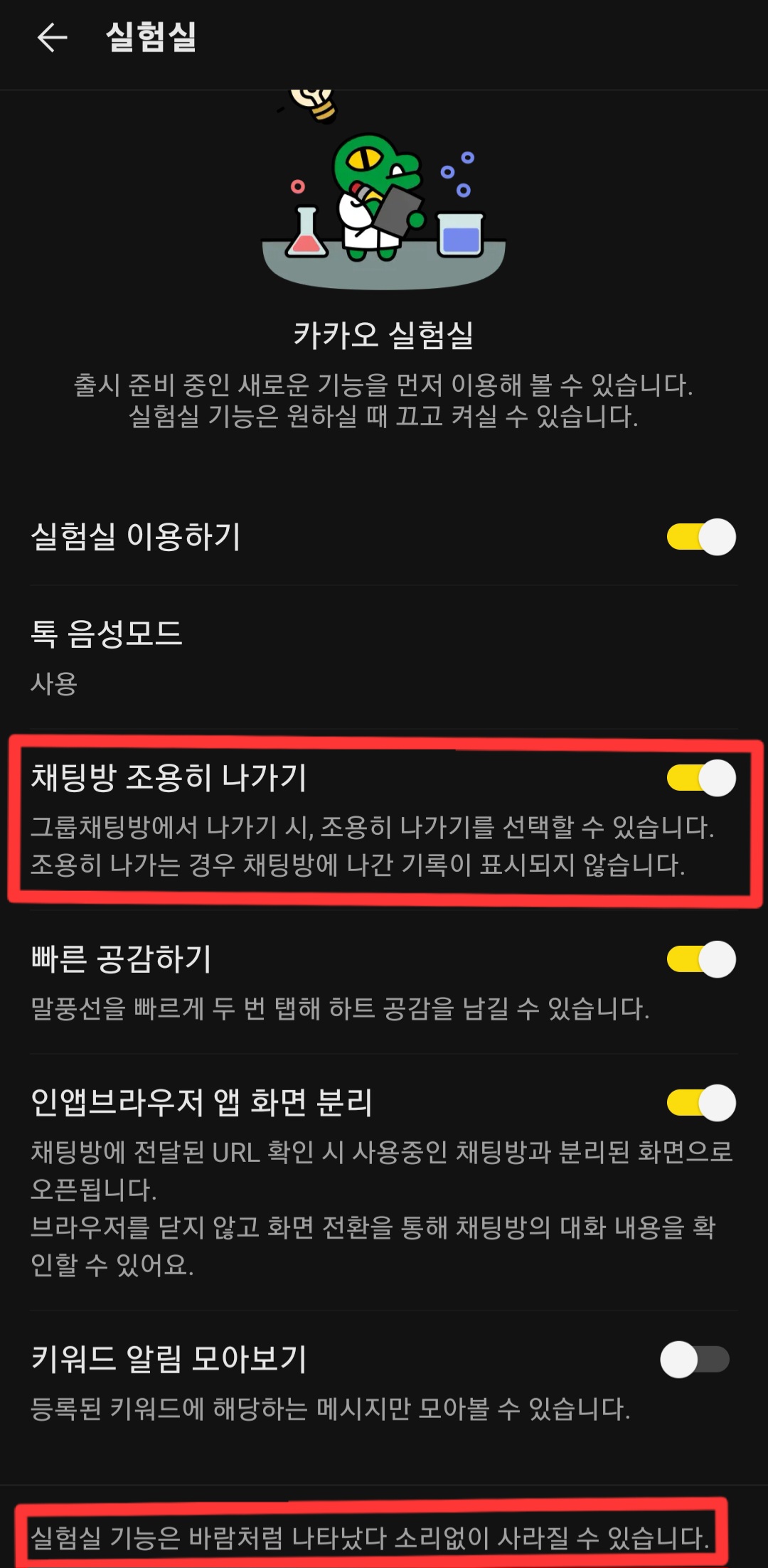 전체 설정 안으로 들어오면 가운데쯤에 실험실 이라는 문구가 보입니다. 실험실을 클릭하면 가장 위에 실험실 이용하기가 있고 실험실 이용하기를 클릭하면 아래 항목들이 활성화됩니다. 이 중에서 우리는 채팅방 조용히 나가기를 클릭해 주면 됩니다. 가장 아래에 '실험실 기능은 바람처럼 나타났다 소리 없이 사라질 수 있습니다'라고 적혀있네요. 실험실에 있는 기능들은 아직 정식 출시되지 않은 기능이라는 뜻입니다.