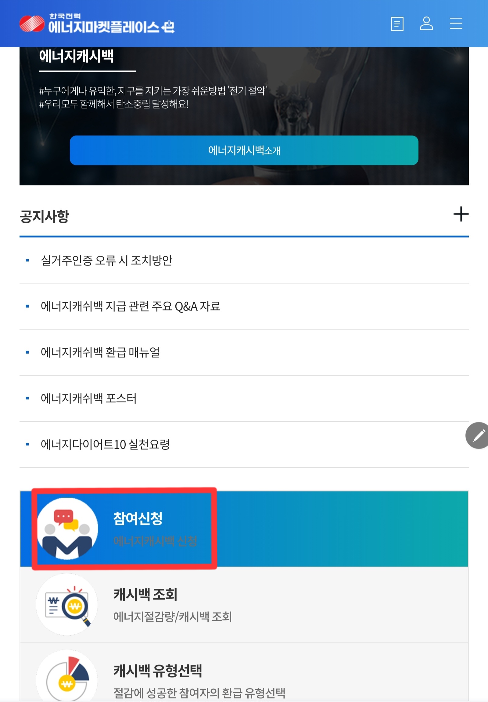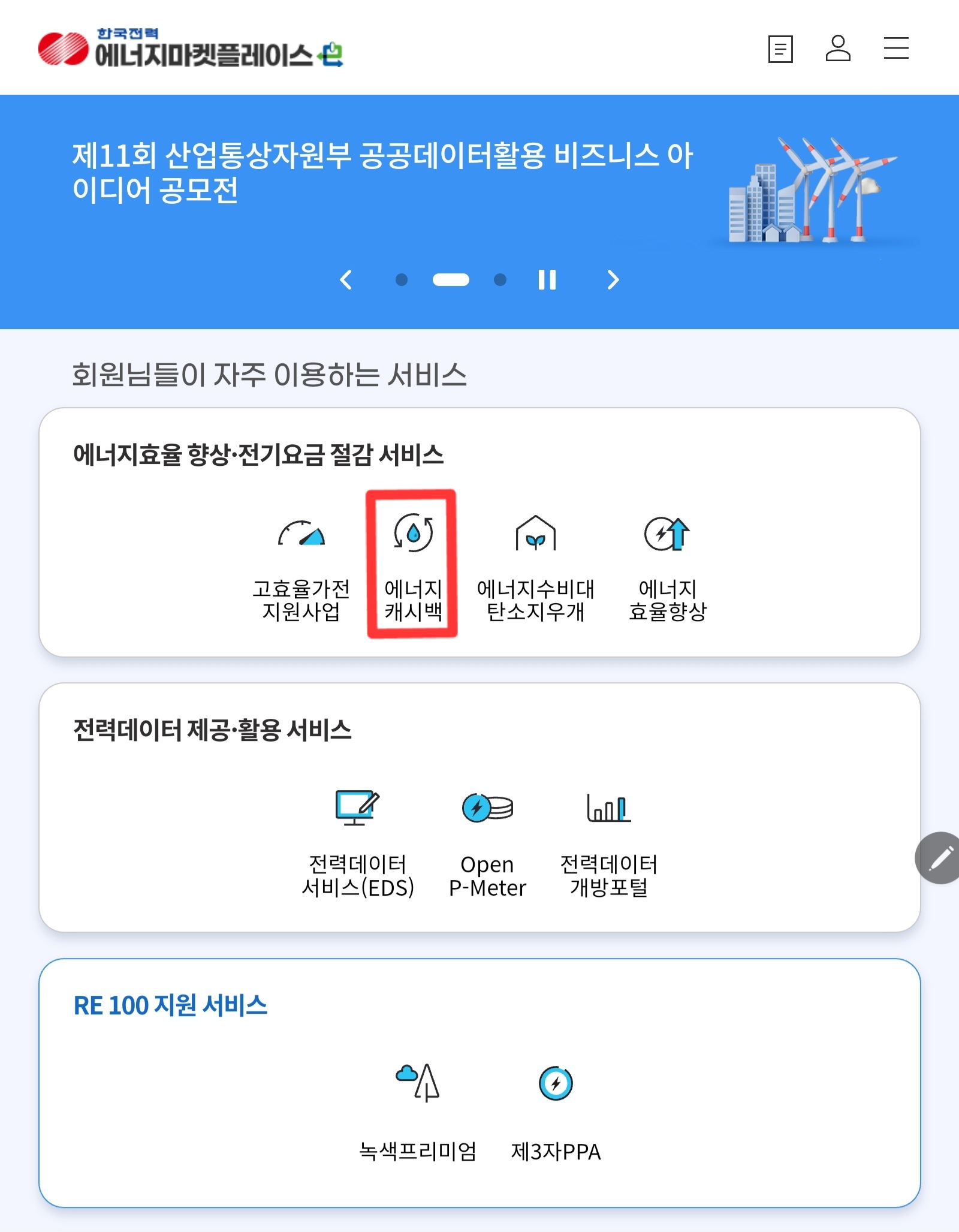 모바일 사용자는 회원님들이 자주 이용하는 서비스 안의 에너지효율 향상-전기요금 절감 서비스의 에너지캐시백을 선택해 주시면 됩니다.