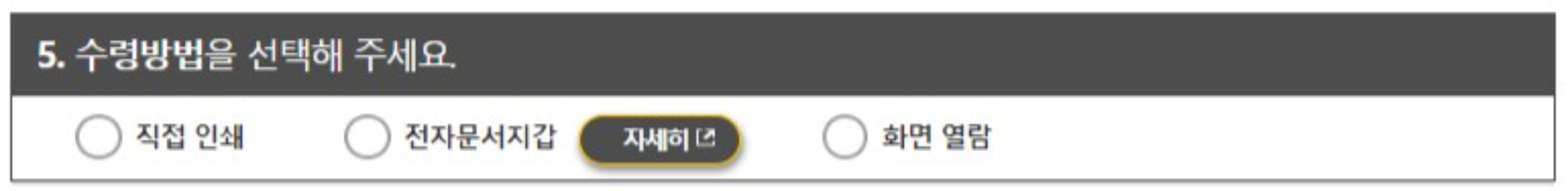 5. 수령방법은 대부분 직접인쇄를 선택해 인쇄하거나 PDF 파일로 저장합니다. 전자문서지갑은 증명서를 내 핸드폰에 저장할 수 있는 방법입니다. 별도의 어플을 설치하면 내 핸드폰에 증명서를 저장할 수 있습니다. 여러 장점이 있겠죠. (하지만 핸드폰으로 증명서를 발급할 수 있다는 의미는 아닙니다.)