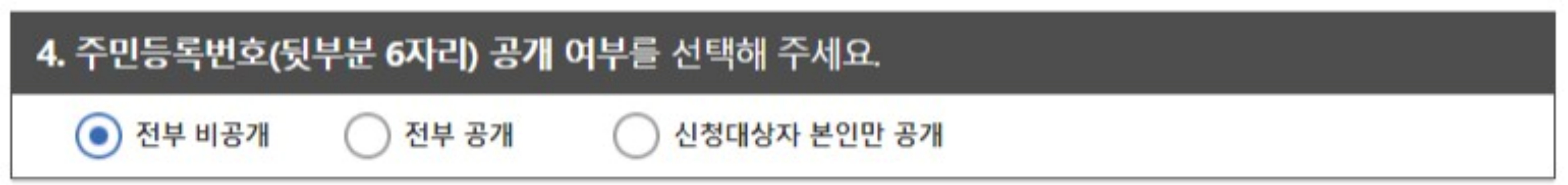 4. 개인정보보호를 위해 대부분의 회사나 기관은 주민등록번호는 비공개로 제출해도 됩니다. 하지만 간혹 공개를 요구하는 경우도 있으니 요구사항을 잘 확인해 선택하면 됩니다.