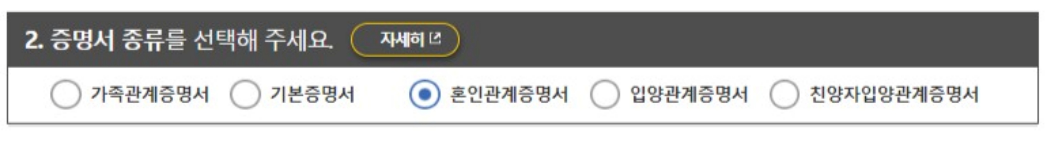 - (상세증명서 발급시) 본인 및 배우자의 혼인 및 이혼에 대한 정보