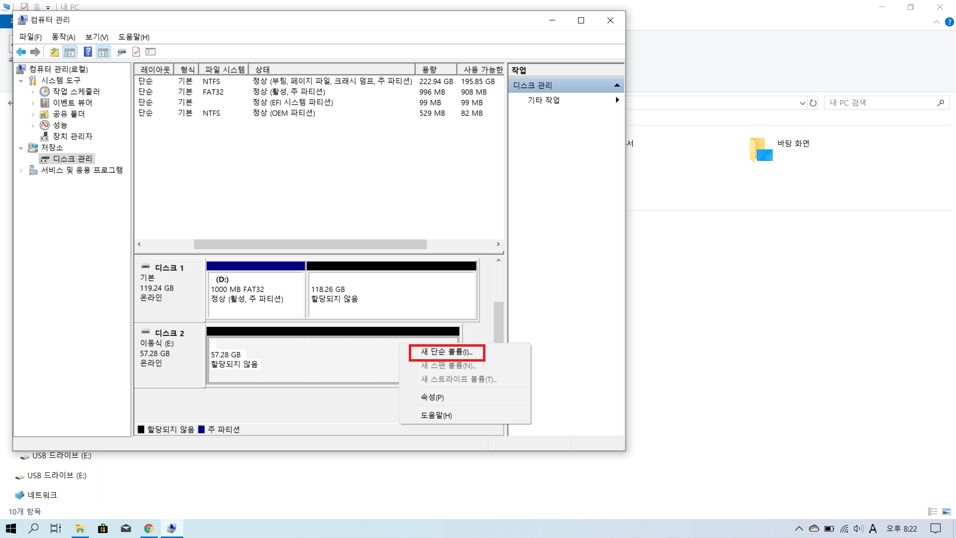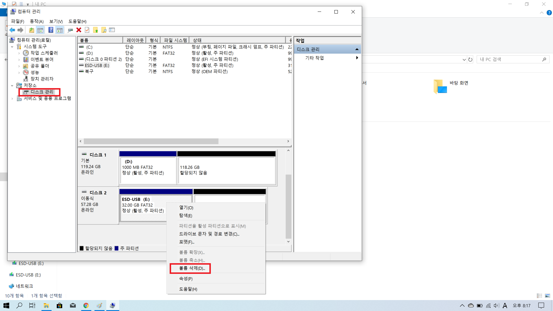 디스크관리에서 ESD-USB 오른쪽 마우스 클릭하셔서